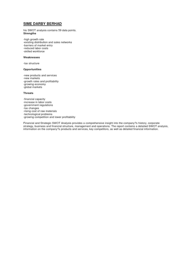 Swot analysis of ioi corporation Swot analysis helps the business to identify its strengths and weaknesses, as well as understanding of opportunity that can be availed and the threat that the company is facing. Sustaining competitive advantage in the oil palm industry: Sime darby berhad swot analysis swot analysis sime darby is a diversified company with business interests in plantations, property, motors, industrial equipment, energy and utilities, and healthcare. Swot analysis threats price fluctuation of cpo could lead to lower demand of palm oil limited supply of high quality seeds land ownership issues recently in borneo, palm oil industry has faced ganoderma basal stem rot (gbsr) disease which is caused by the woodrotting fungus sime darby sime darby parent company sime darby berhad category.